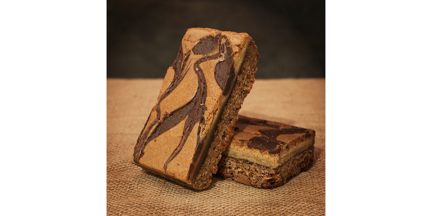 Our Hazelnut Blondie Flapjack starts with a flapjack base, covered with a layer of chocolate hazelnut and all topped with white chocolate brownie (blondie). We add a generous swirl of chocolate hazelnut to add a delicate praline flavour.