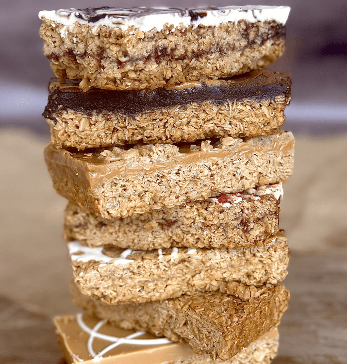 Flapjack topped with a dark chocolate and peanut butter brownie.
