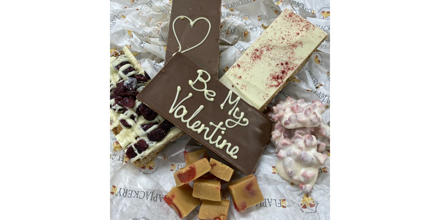This unique Hamper includes three giant flapjacks: a decadent Cranberry and White Chocolate Flapjack, our irresistible Raspberry Millionaires Flapjack, and our Millionaires Flapjack piped with a white chocolate heart. A bag of our new delightful Strawberries and Cream Clusters, a bag of our handmade Cherry Fudge, and a Milk Chocolate Bar piped with the message, ‘Be My Valentine’. All our scrumptious products are lovingly handmade in our Devon bakery with only the finest locally sourced ingredients.